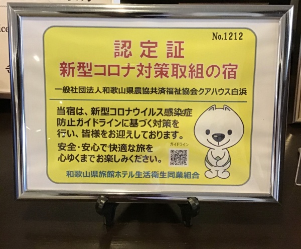 この度、クアハウス白浜は和歌山県より【新型コロナ対策取組の宿】の認定証をいただきました!(‘◇’)ゞ
