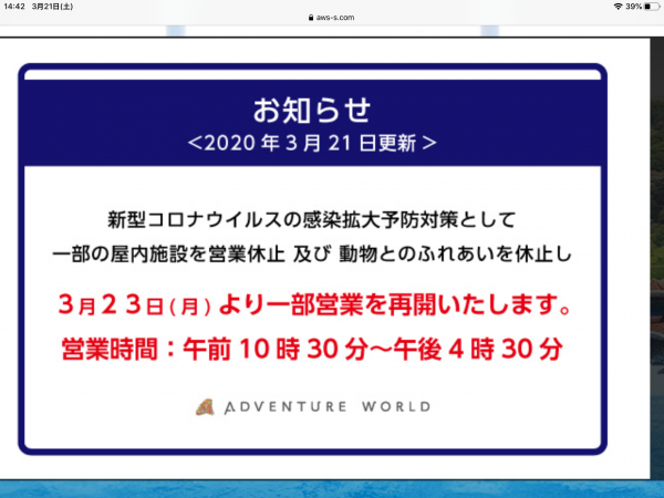 アドベンチャーワールドが待望の営業再開です!
