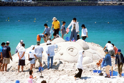 エントリーしたチームが日の出から砂の山に取り掛かり、約半日かかりですなのオブジェを築き上げます。
