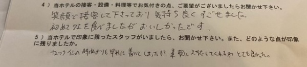 お客様の声 お知らせ スタッフブログ お客様の声 月別アーカイブ 2026年2月 2026年1月 2025年12月 2025年11月 2025年10月 2025年9月 2025年8月 2025年7月 2025年6月 2025年5月 2025年4月 2025年3月 2025年2月 2025年1月 2024年12月 2024年11月 2024年10月 2024年9月 2024年8月 2024年6月 2024年4月 2024年3月 2024年2月 2024年1月 2023年12月 2023年11月 2023年10月 2023年9月 2023年8月 2023年7月 2023年6月 2023年5月 2023年4月 2023年3月 2023年2月 2023年1月 2022年12月 2022年11月 2022年10月 2022年9月 2022年8月 2022年7月 2022年6月 2022年5月 2022年4月 2022年3月 2022年2月 2022年1月 2021年12月 2021年11月 2021年10月 2021年9月 2021年8月 2021年7月 2021年6月 2021年5月 2021年4月 2021年3月 2021年2月 2021年1月 2020年12月 2020年11月 2020年10月 2020年9月 2020年8月 2020年7月 2020年6月 2020年5月 2020年4月 2020年3月 2020年2月 2020年1月 2019年12月 2019年11月 2019年10月 2019年9月 2019年8月 2019年7月 2019年6月 2019年5月 2019年4月 2019年3月 2019年2月 2019年1月 2018年12月 2018年11月 2018年10月 2018年9月 2018年8月 2018年7月 2018年6月 2018年5月 2018年4月 2018年3月 2018年2月 2018年1月 2017年12月 2017年11月 2017年10月 2017年9月 2017年8月 2017年7月 2017年6月 2017年5月 2017年4月 2017年3月 2017年2月 2017年1月 2016年12月 2016年11月 2016年10月 2016年9月 2016年8月 2016年7月 2016年6月 2016年5月 2016年4月 2016年3月 2016年2月 2016年1月 2015年12月 2015年11月 2015年10月 2015年9月 2015年8月 2015年7月 2015年6月 2015年5月 2015年4月 2015年3月 2015年2月 2014年12月 2014年11月 2014年10月 2014年9月 2014年8月 2014年6月 2014年5月 2014年4月 2014年3月 2014年2月 2014年1月 2013年12月 2013年11月 2013年10月 2013年9月 2013年8月 2013年6月 2013年5月 2013年4月 2013年3月 2013年2月 2013年1月 2012年12月 2012年11月 2012年10月 2012年9月 2012年8月 2012年7月 2012年6月 2012年5月 2012年4月 2012年3月 2012年2月 2012年1月 2011年10月 令和3年1月お客様アンケート集計結果(*’ω’*) お客様の声 2021.02.08 1月にご宿泊頂いたお客様にアンケートのご協力をいただきました。 一部、ご紹介いたします。 1)旅行形態について 1.家族旅行(32組) 2.知人・友人との旅行(7組) 3.インターネット(11組) 2)お褒めの言葉 ・接客がとても気持ち良かった。 ・鮑が最高!美味しかったです。 ・清潔感があって良かった。 3)改善・要望 ・お部屋にコーヒーが欲しい。 ・卓球台を置いて欲しい。 ・アメニティに髪の毛のゴムが欲しい。 たくさんのご意見ありがとうございます(´ω`) これからも癒しの宿クアハウス白浜を宜しくお願い致しますヾ(≧▽≦)ノ